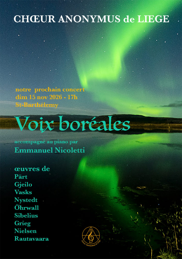 Le Chœur Anonymus de Liège est né de la volonté d’un groupe de musiciens passionnés par le chant choral. Nous sommes animés par la recherche de la beauté, à travers la simplicité et la complexité, à travers la polyphonie, la musique classique et contemporaine. Notre coeur bat l’air du temps.